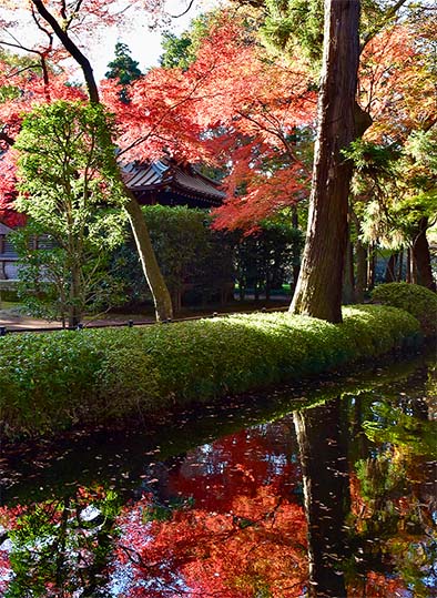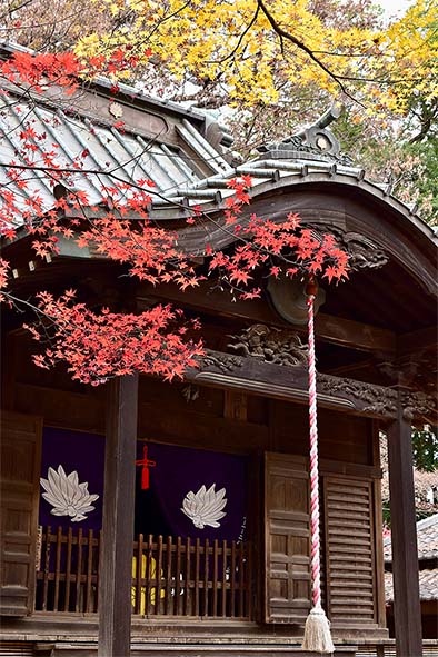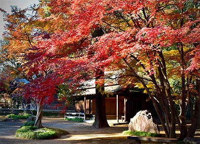 平林寺の紅葉は赤、黄、緑の彩りの美しさが特徴です。伽藍を取り囲む雑木林に、モミジは赤、クヌギやコナラは黄に色づいて、濃緑のマツが禅宗寺院の趣を湛えます。